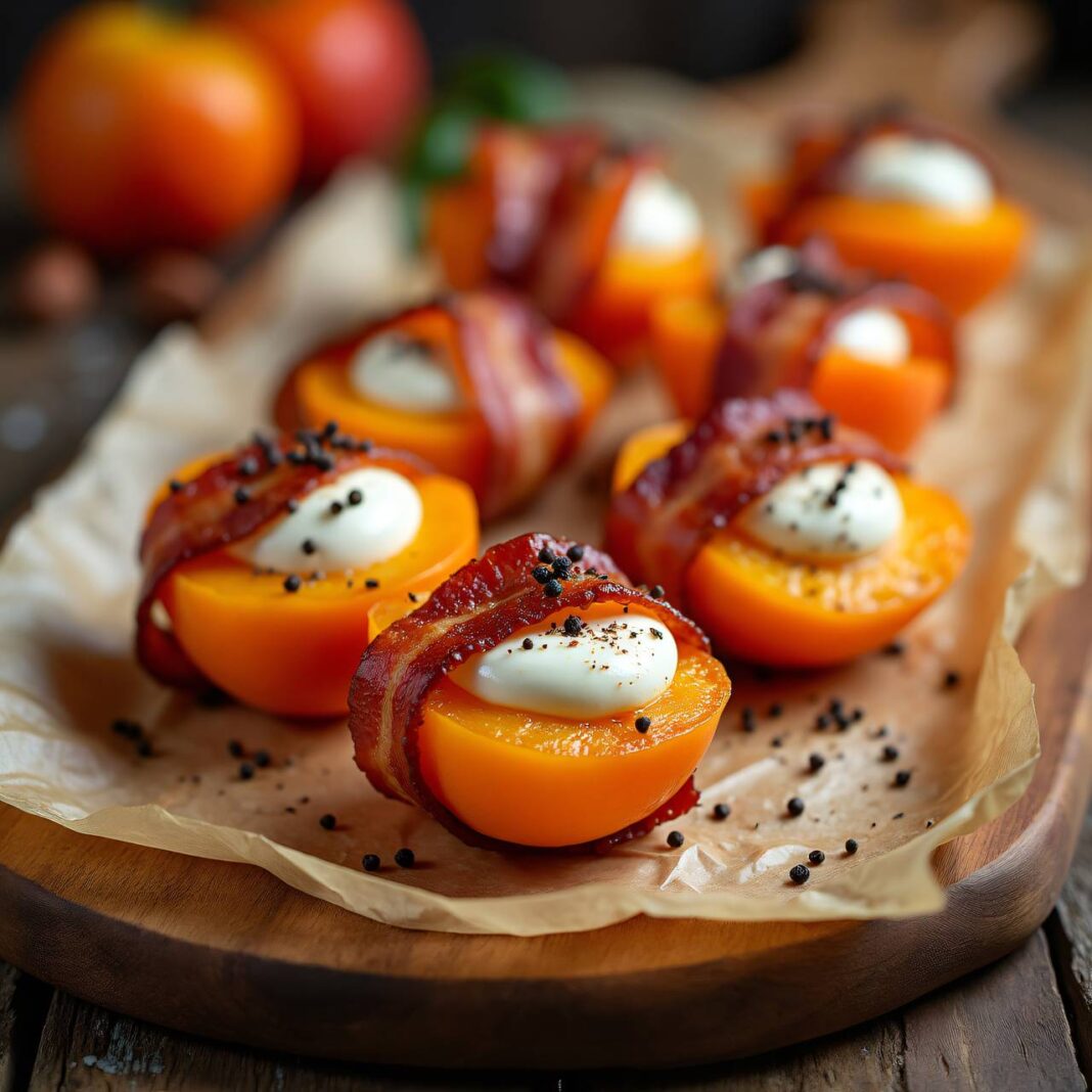 Ein köstliches Rezept für Aperitif-Aprikosen, gefüllt mit Mozzarella und umwickelt mit Frühstücksspeck.