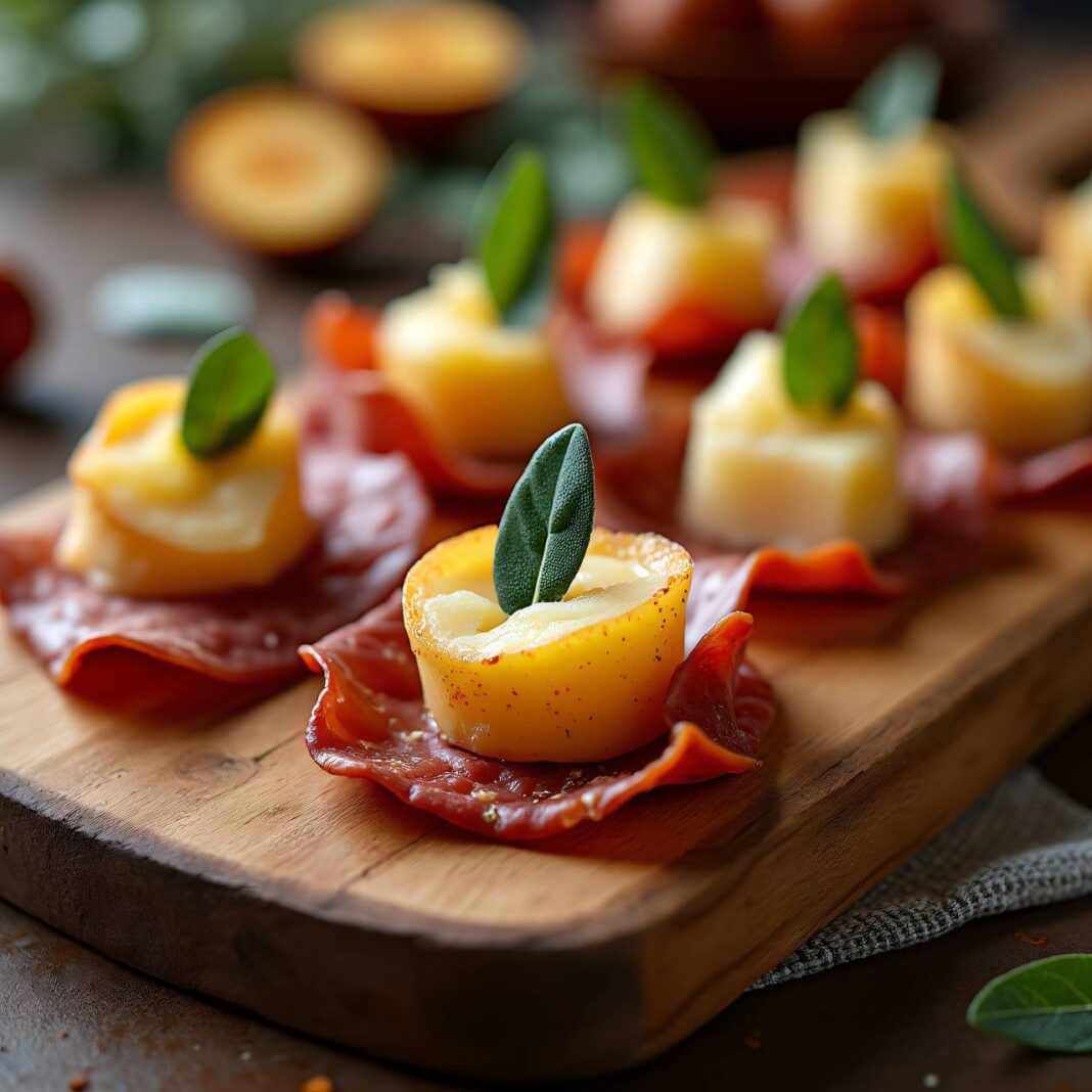 Leckere Aperitif-Häppchen mit getrockneten Birnen, Tomme-Käse und Trockenfleisch, perfekt für gesellige Anlässe.