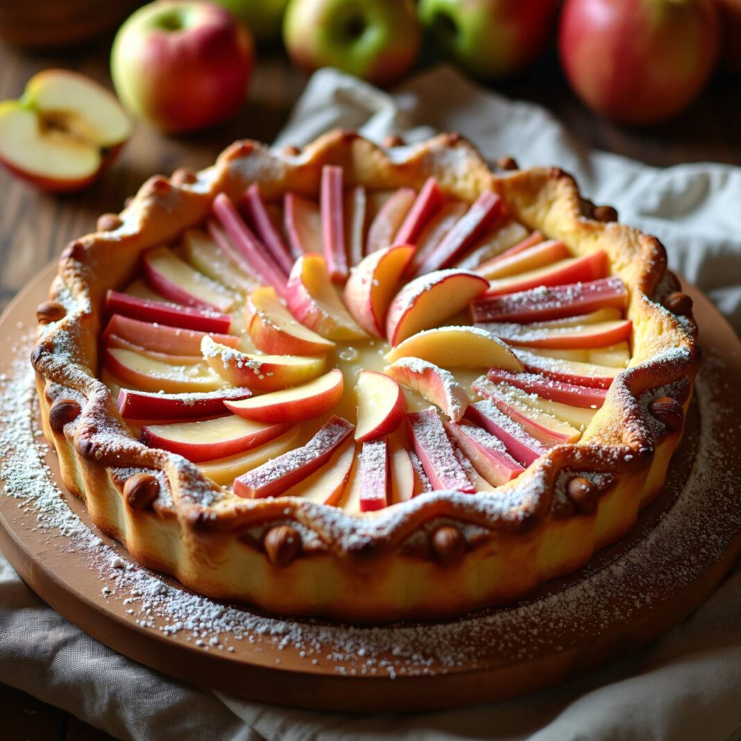 Ein köstlicher Blechkuchen mit einer fruchtigen Füllung aus Äpfeln und Rhabarber, bedeckt mit knusprigen Streuseln.