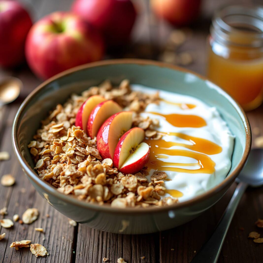 Ein köstliches und gesundes Müsli mit Äpfeln und Sirup, perfekt für ein nahrhaftes Frühstück.