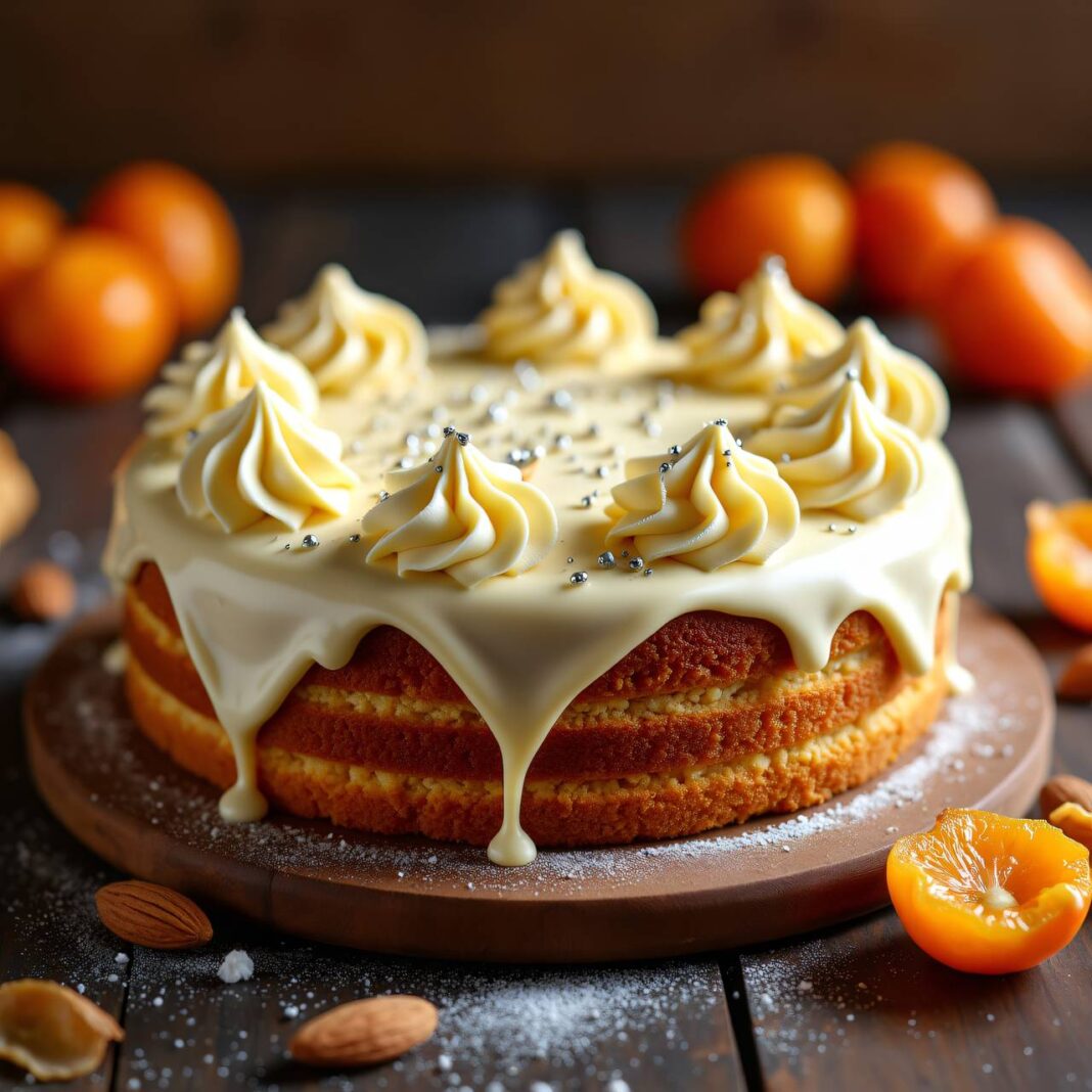Ein saftiger Aprikosen-Mandel-Cake, der mit einem köstlichen Schokoladen-Sahne-Frosting verziert ist.