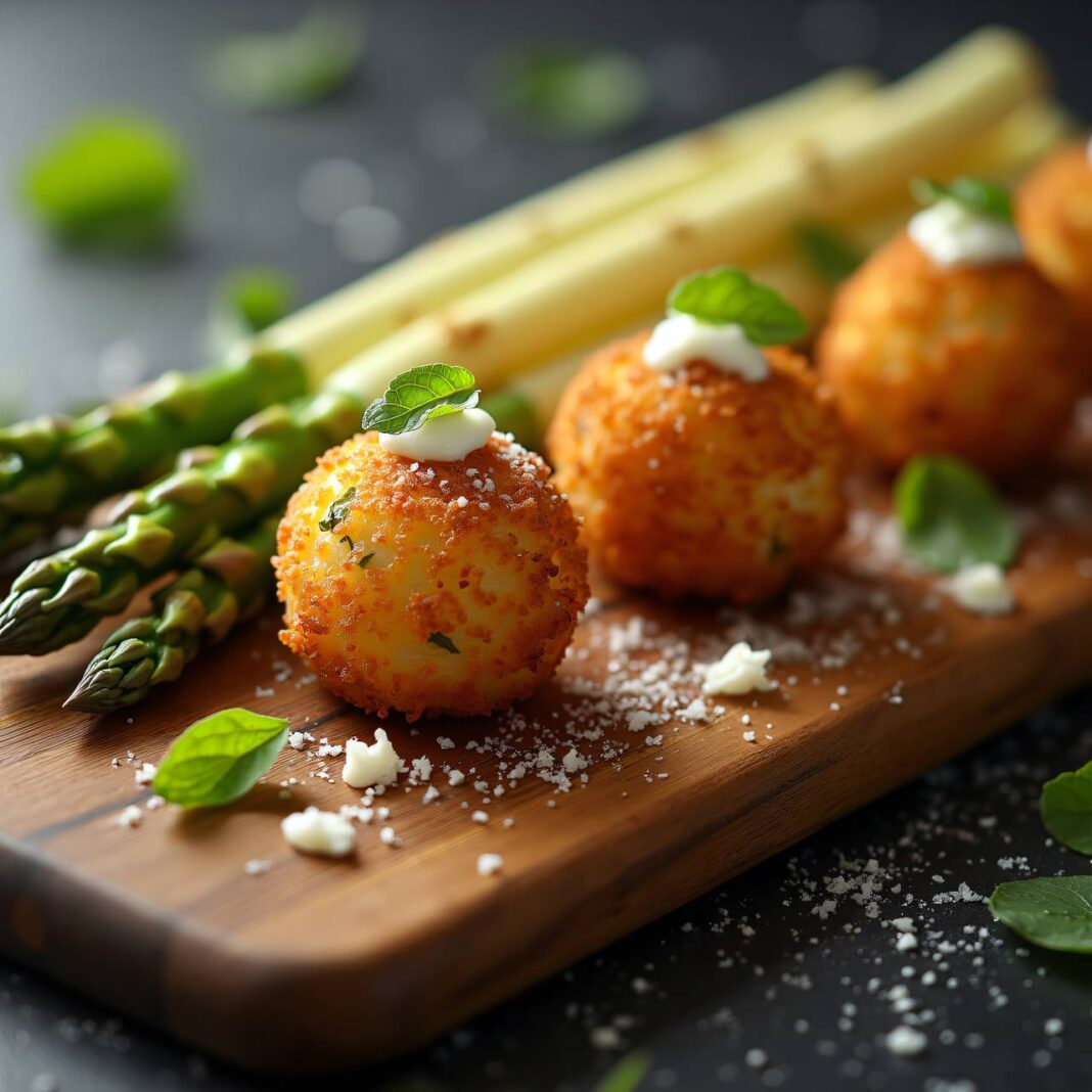 Köstliche Arancini gefüllt mit einer Mischung aus Rucola und Ricotta, serviert mit Spargeln.