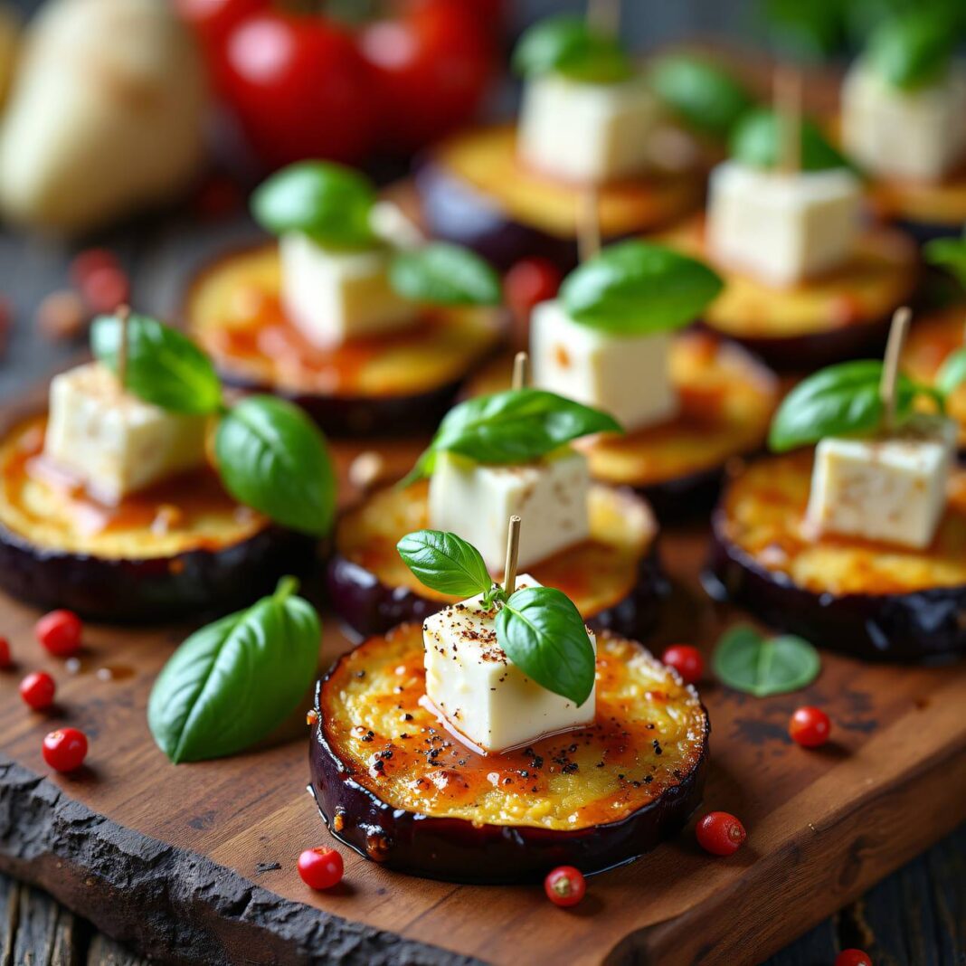 Leckere Auberginen-Häppchen mit Frischkäse und Basilikum, perfekt als Snack oder für Partys.