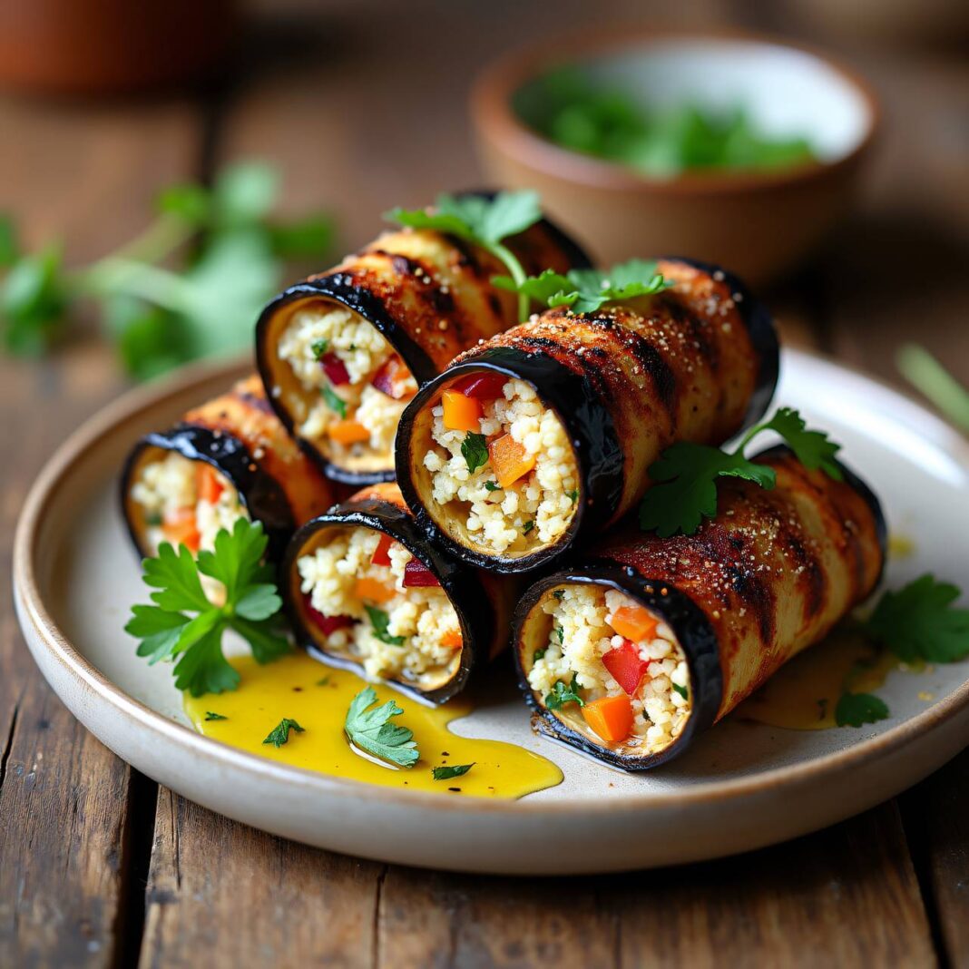 Leckere Auberginenrollen gefüllt mit einer gesunden Quinoa-Frischkäse-Mischung, perfekt als Vorspeise oder Hauptgericht.