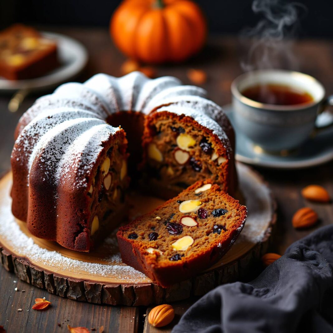Ein traditioneller Früchtekuchen, perfekt für Halloween, der mit Dörrobst und Mandelsplittern zubereitet wird.