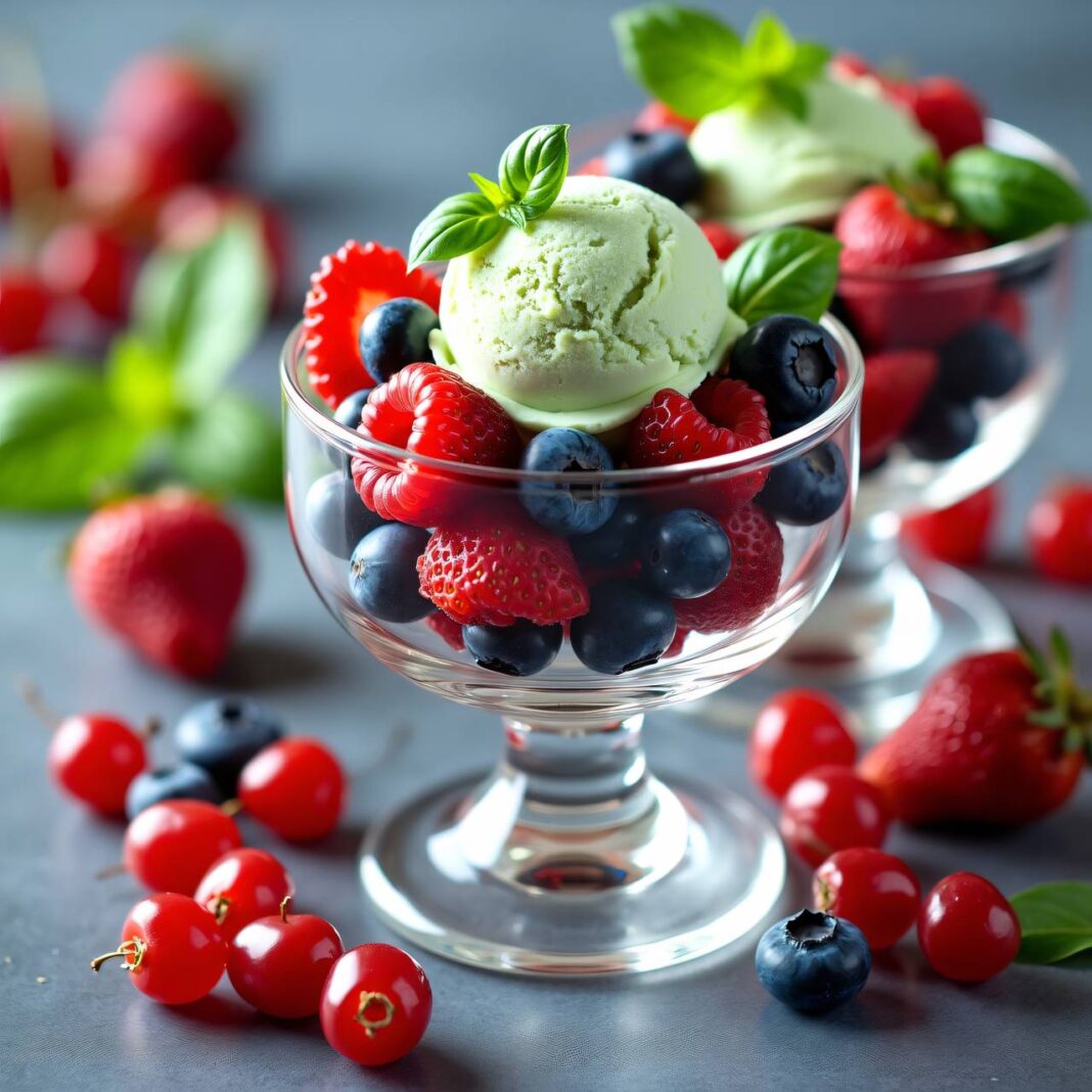 Ein erfrischendes Dessert mit hausgemachtem Basilikum-Eis und marinierten Beeren.