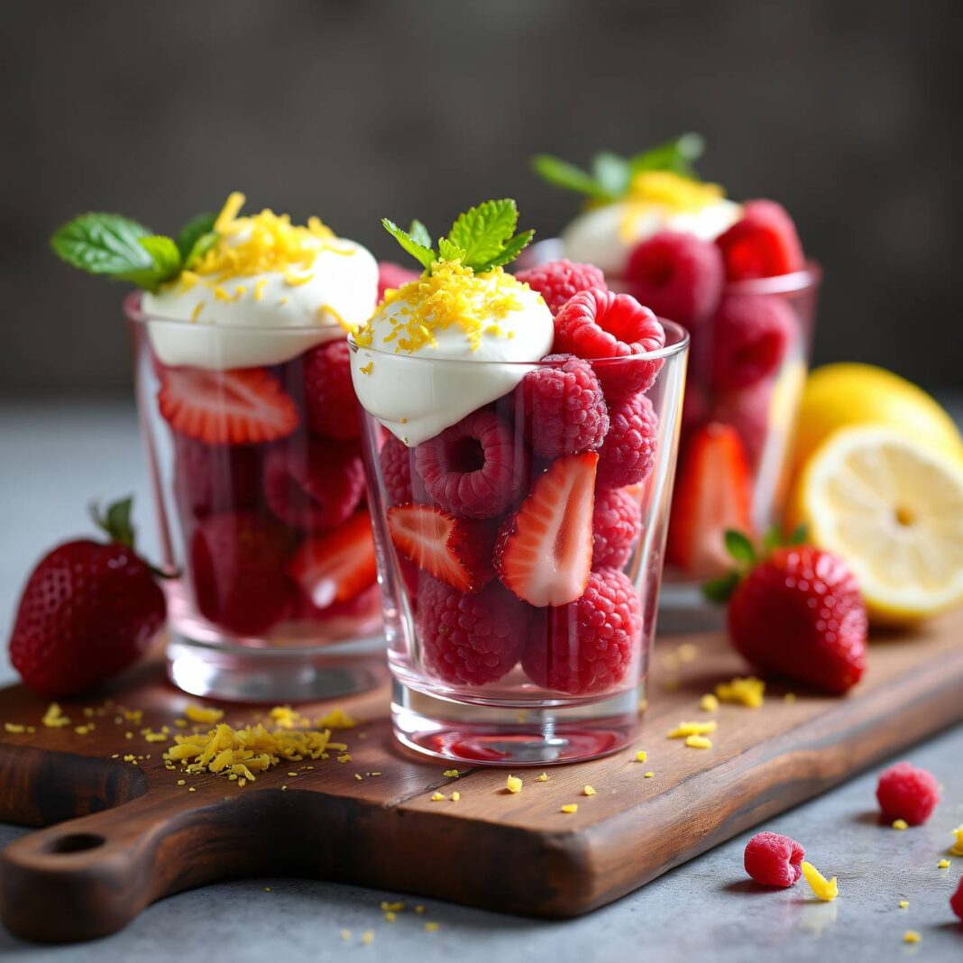 Anrichten: Den flaumigen Zitronenrahm auf die vorbereiteten Beeren in den Gläsern geben. Mit zusätzlichen Zitronenzesten garnieren und servieren.