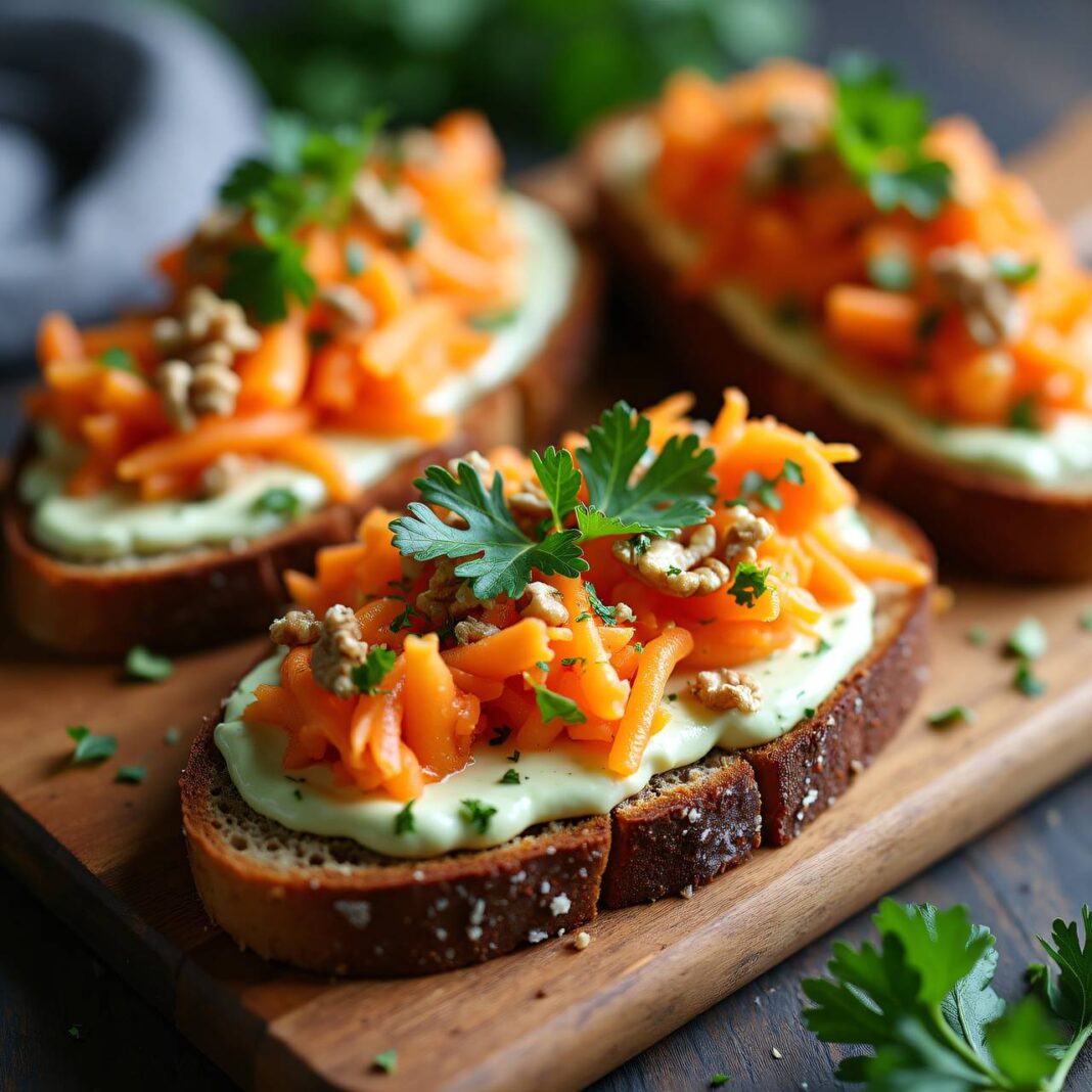 - Verteilen Sie die Karotten-Sellerie-Mischung gleichmäßig auf den getoasteten Brotscheiben und richten Sie diese auf Tellern an.
