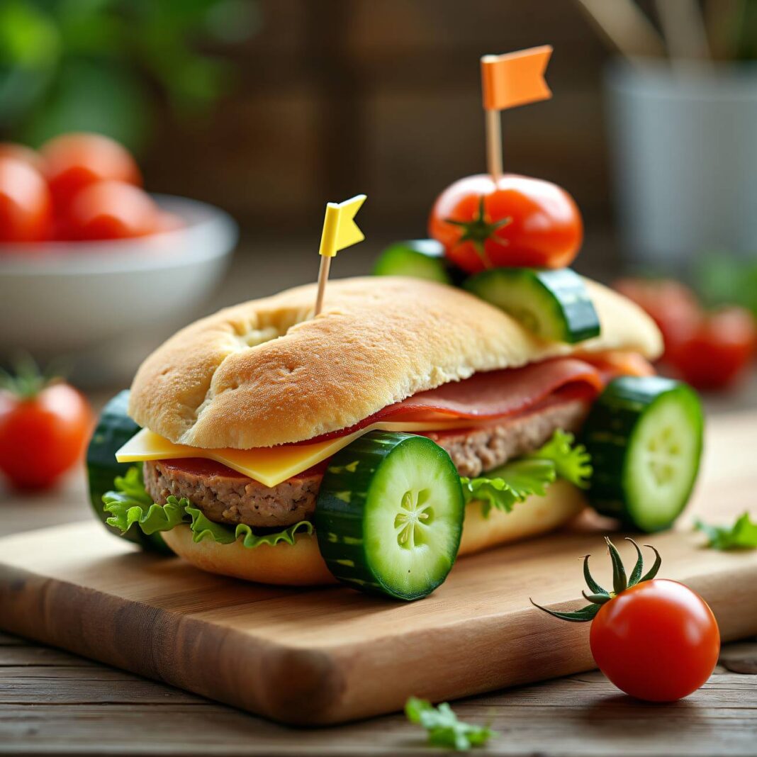 Räder anbringen: Je eine Gurkenscheibe und eine halbe Cherrytomate auf einen Zahnstocher stecken und die Zahnstocher seitlich am belegten Brötchen fixieren, um die Räder zu gestalten.