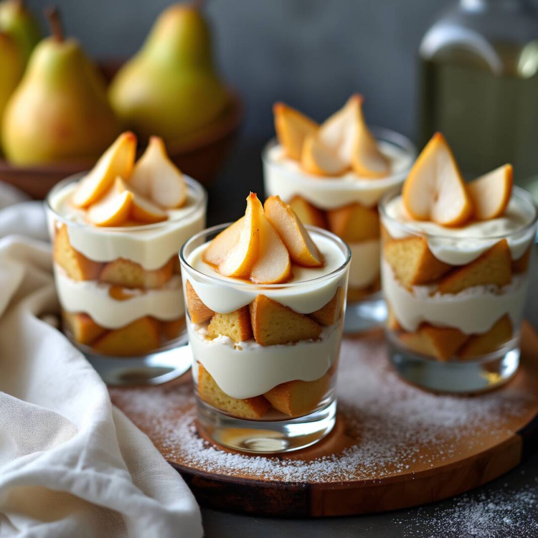 Ein köstliches Birnen-Trifle, das aus Biskuit, Birnen und einer cremigen Mascarpone-Füllung besteht.