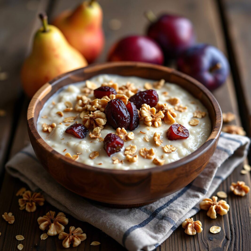 Ein köstliches und nahrhaftes Porridge mit geriebenen Birnen, Zwetschken und Datteln, perfekt für ein gesundes Frühstück.