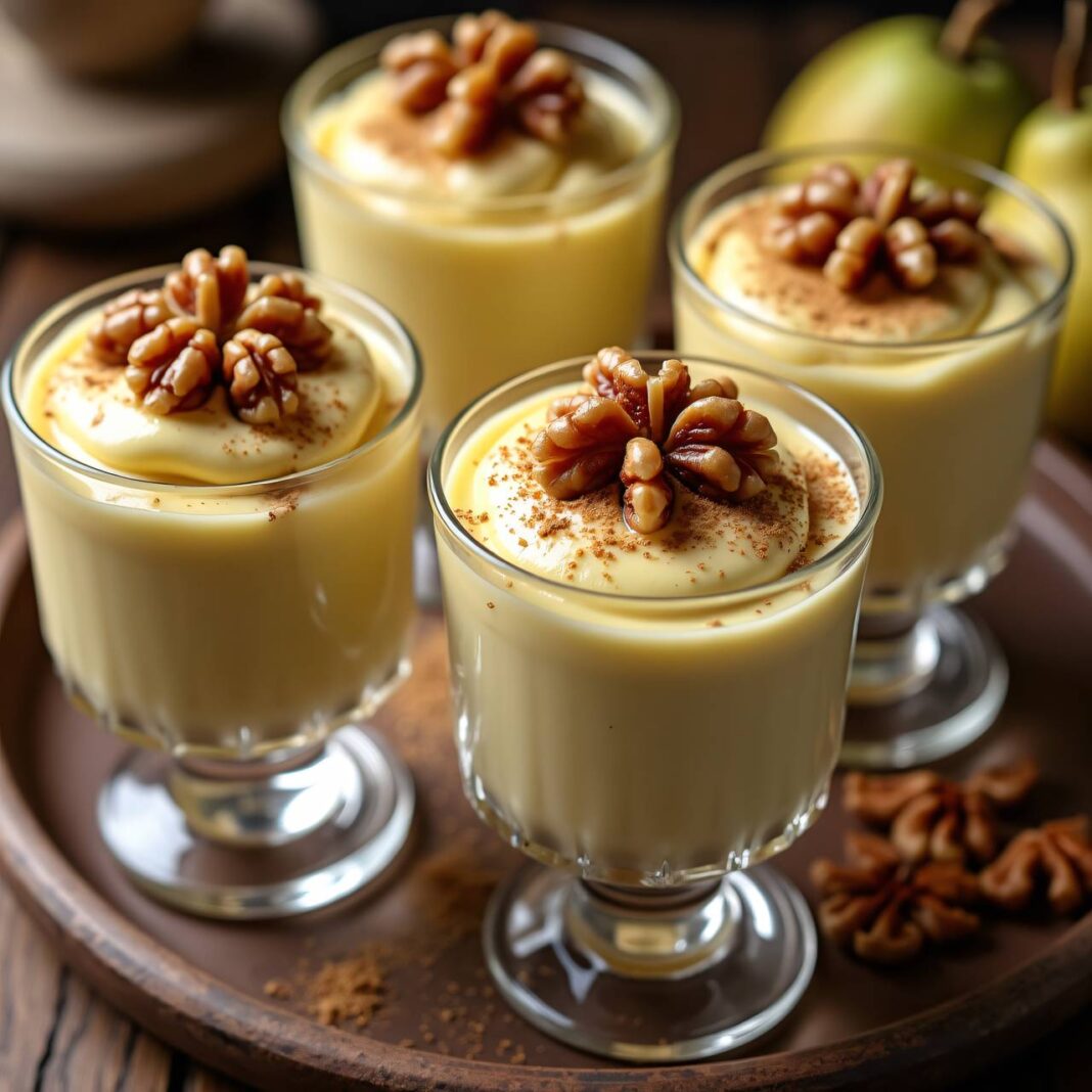 Ein köstliches Dessert aus geschälten und entkernten Birnen, verfeinert mit Honig und Muskatnuss oder Zimt, serviert mit karamellisierten Walnüssen.