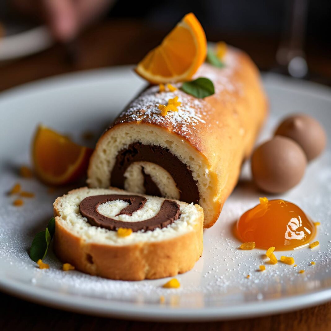 Eine köstliche Biskuitroulade gefüllt mit einer feinen Espresso-Mousse, perfekt für Dessertliebhaber.