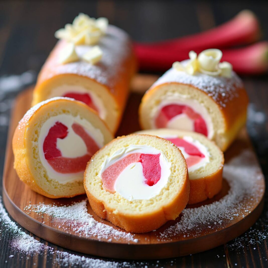 Eine köstliche Biskuitroulade gefüllt mit Rhabarber und Sahne, perfekt für einen süßen Abschluss.