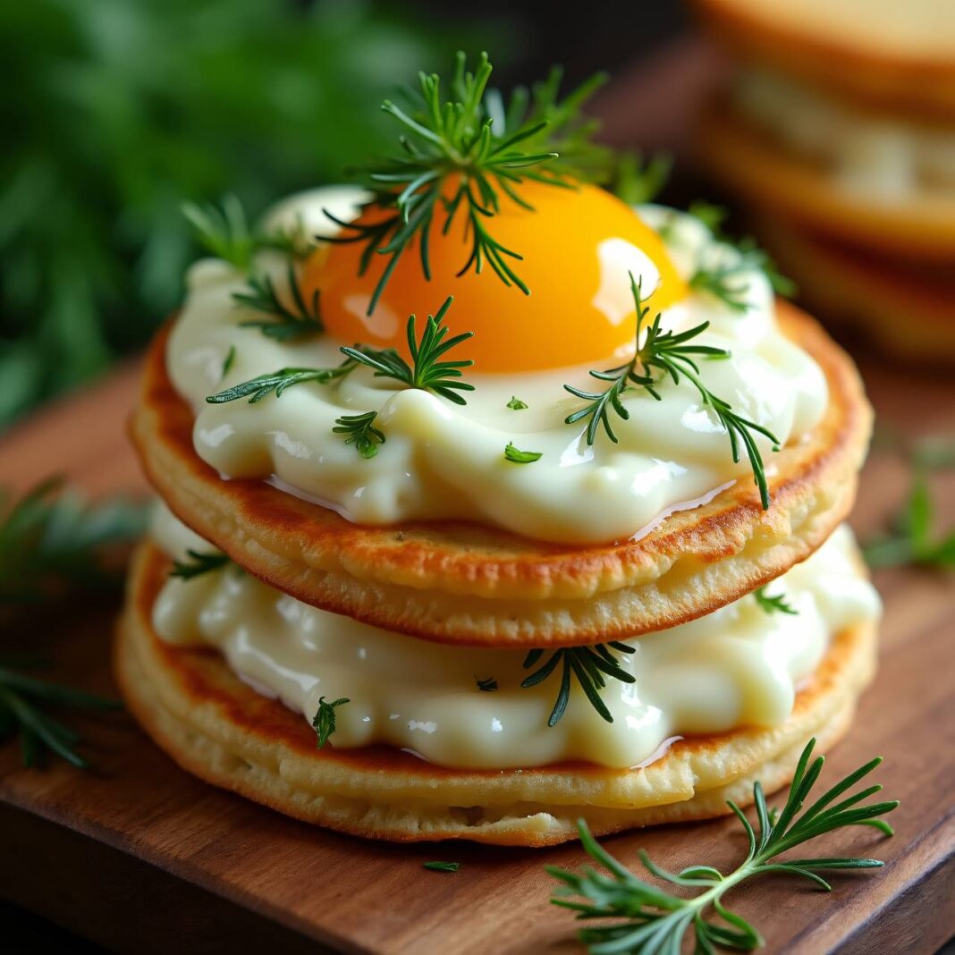 - Garniere die Blinis mit fein gehacktem Dill und gehacktem Eigelb.