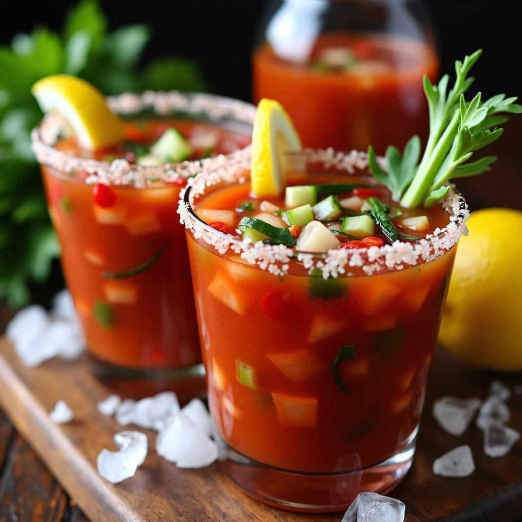 Eine erfrischende und würzige Suppe, die auf der klassischen Bloody Mary basiert, perfekt für warme Tage.