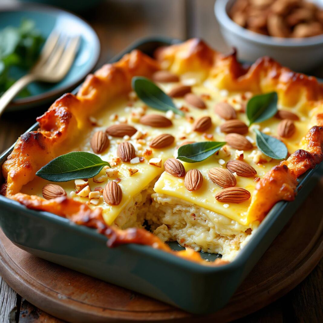 Servieren: Garnieren Sie die Lasagne vor dem Servieren mit frischen Salbeiblättern und grob gehackten Mandeln.
