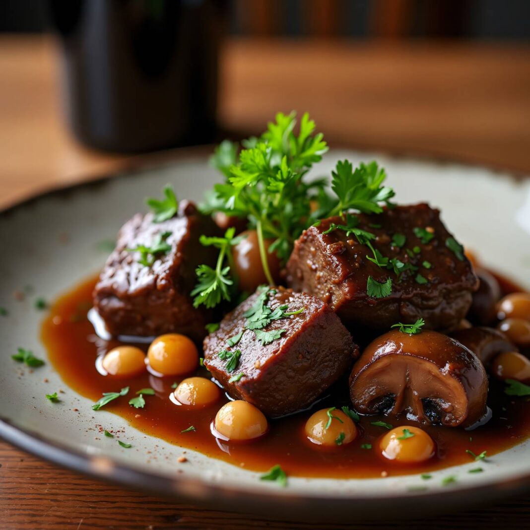 Ein klassisches französisches Gericht aus zartem Rindfleisch, Gemüse und rotem Wein, langsam geschmort für intensiven Geschmack.