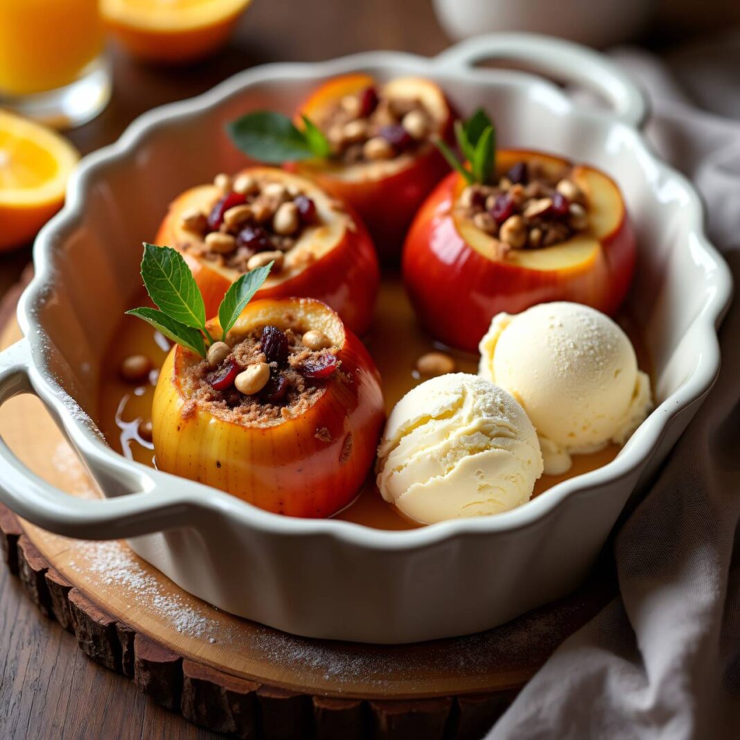 Leckere Bratäpfel gefüllt mit einer Mischung aus Nüssen und Trockenfrüchten, serviert mit Vanilleeis.