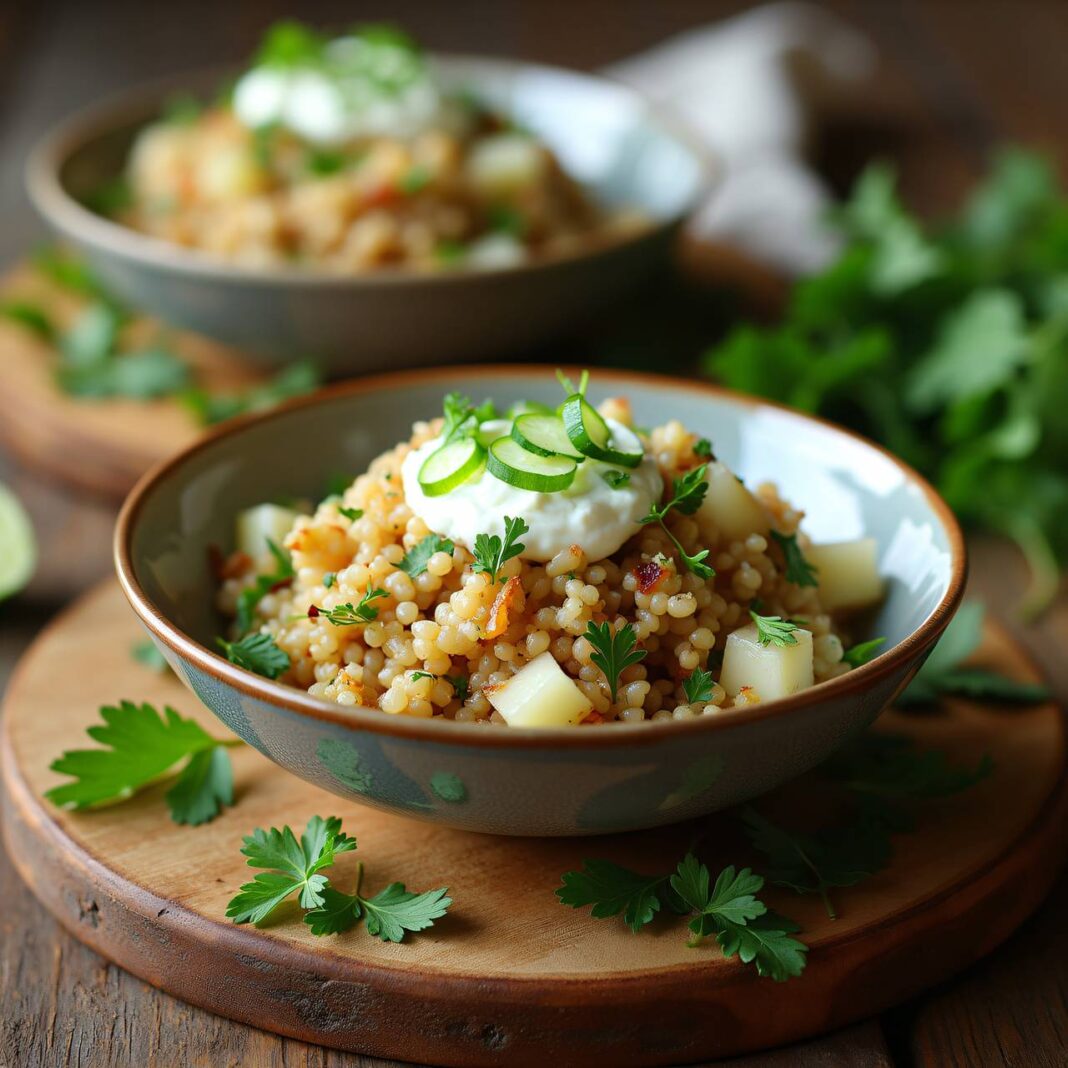 Ein erfrischender Salat aus Buchweizen, Kohlrabi und Hüttenkäse, ideal für eine gesunde Mahlzeit.