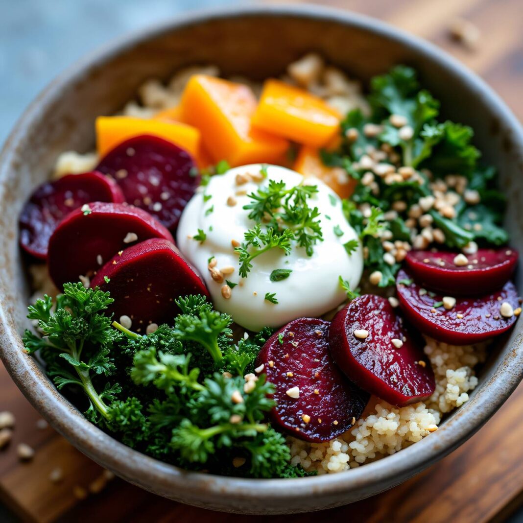 Eine gesunde und leckere Bulgur-Bowl mit roten Rüben, Grünkohl und einem cremigen Sesam-Quark.