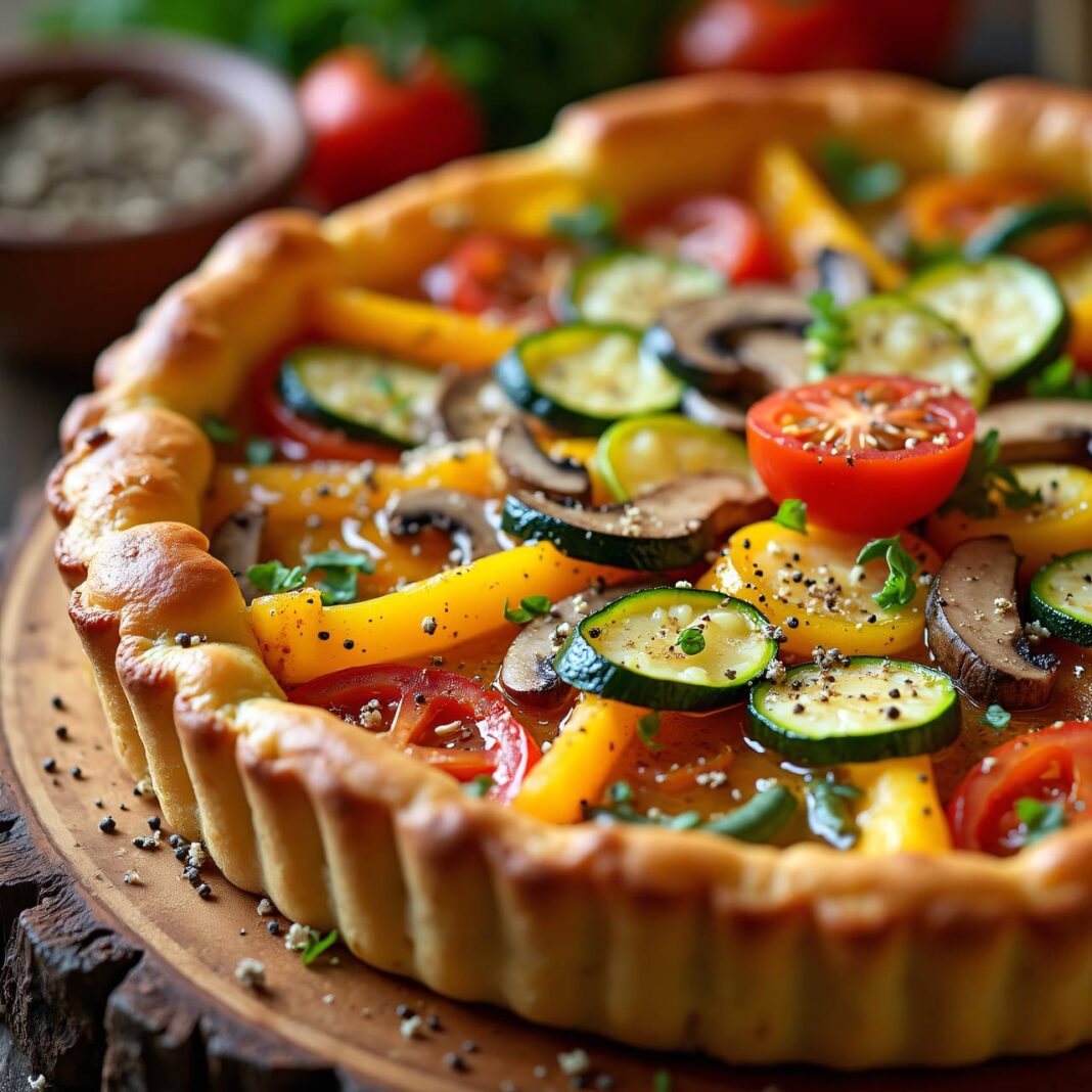 Ein bunter Gemüseblechkuchen mit einer köstlichen Füllung aus verschiedenen Gemüsesorten, Speck und Käse, ideal für eine gesunde und leckere Mahlzeit.