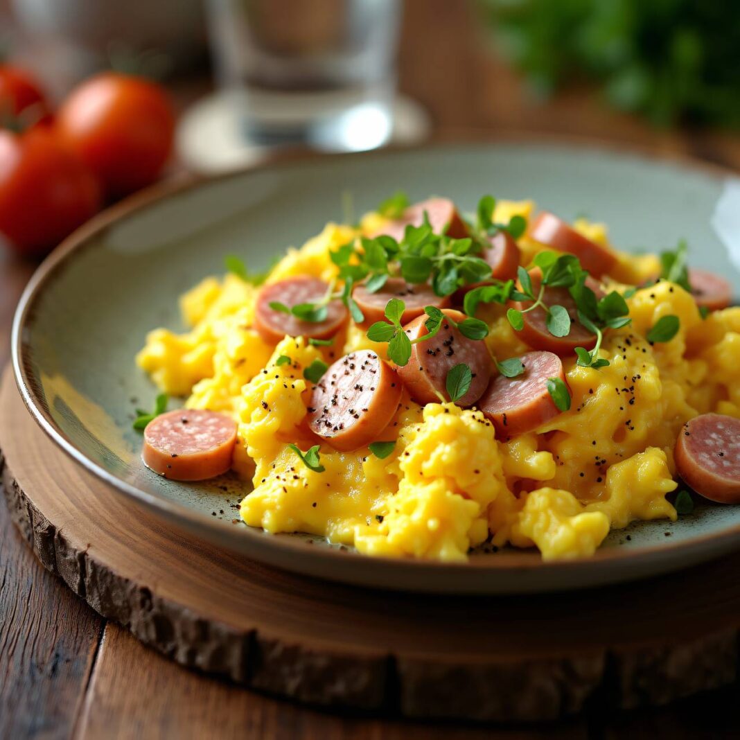 Ein köstliches Rührei mit Burenwürsten und frischer Kresse, perfekt für ein herzhaftes Frühstück.
