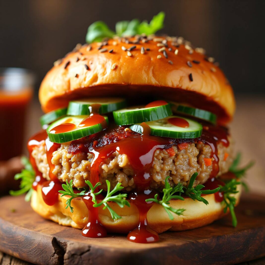Ein köstlicher Burger mit selbstgemachten Kartoffel-Buns und einer würzigen Barbecuesauce.