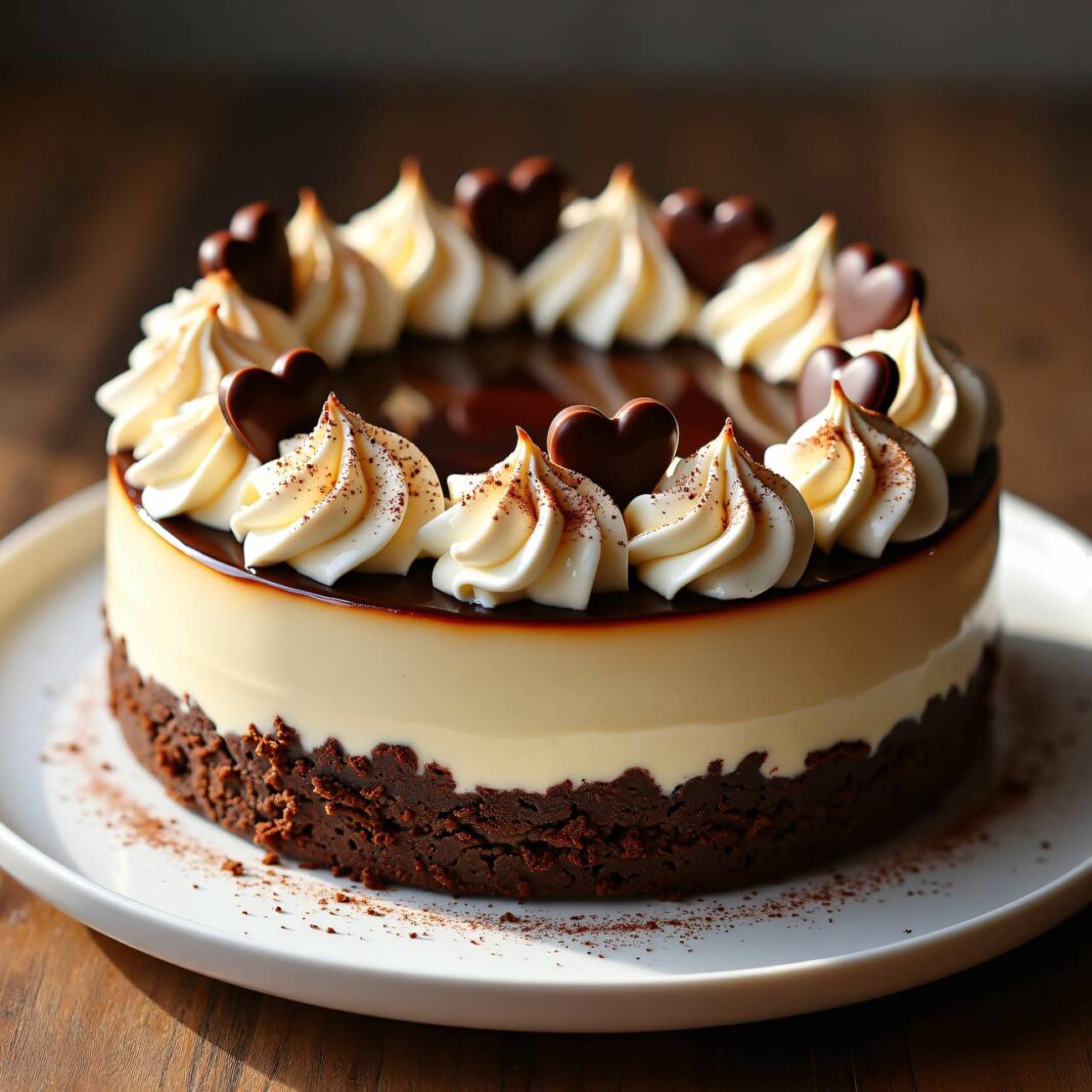 Ein köstlicher Cappuccino-Cheesecake mit einem knusprigen Biskuitboden und einer cremigen Füllung, garniert mit Schlagobers und Schokoladenherzen.