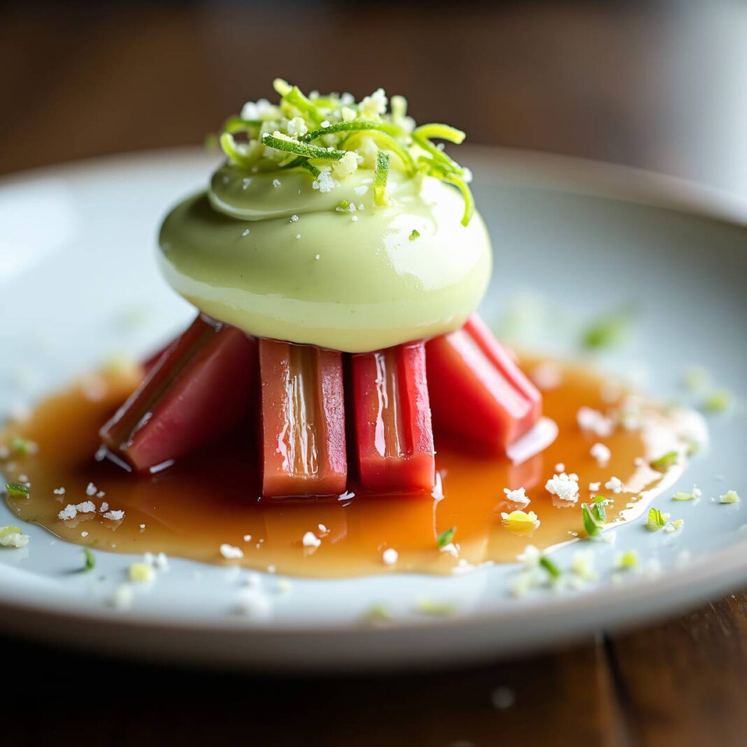 Ein köstliches Dessert mit karamellisierten Rhabarberstücken, serviert mit Limetten-Obers.
