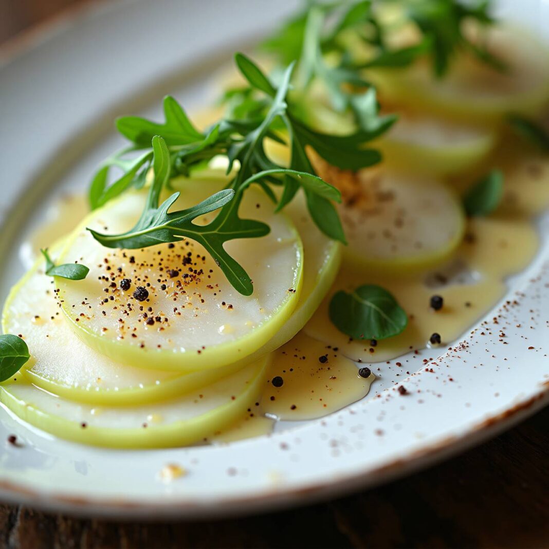 Ein erfrischendes Carpaccio aus Fenchel und Birnen, verfeinert mit Rucola und Hobelkäse.