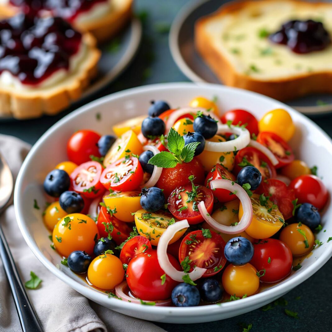 Ein erfrischender Salat aus Cherrytomaten und Heidelbeeren, serviert mit köstlichen Käse-Toast.
