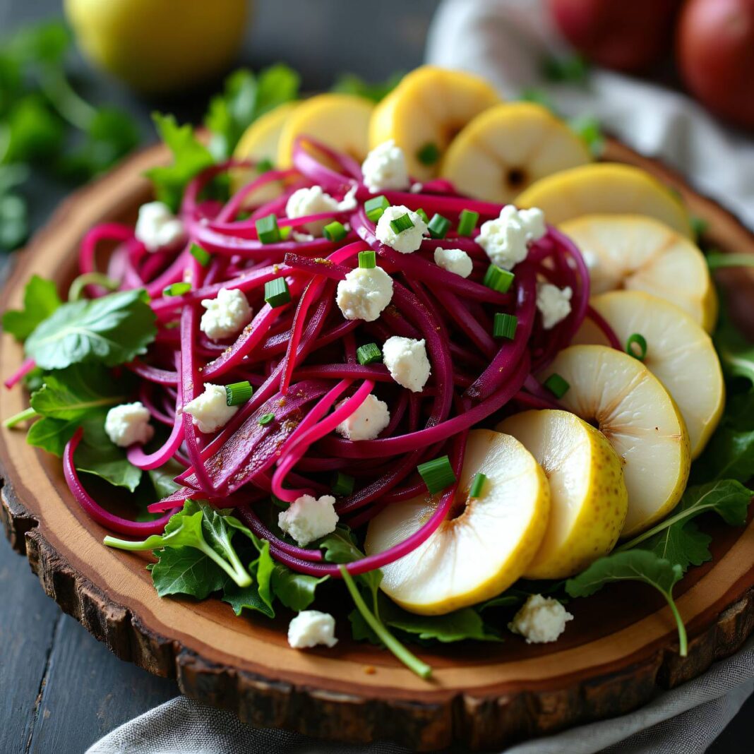 Ein erfrischender Chicorée-Birnen-Salat mit einer leckeren Sauce aus Essig, Rapsöl und Birnendicksaft, perfekt für jede Gelegenheit.