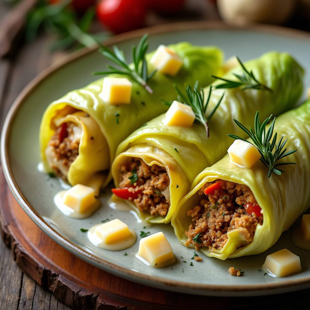 Ein köstliches Gericht mit Chinakohlblättern gefüllt mit einer herzhaften Wurstfüllung und serviert in einer cremigen Brühe.