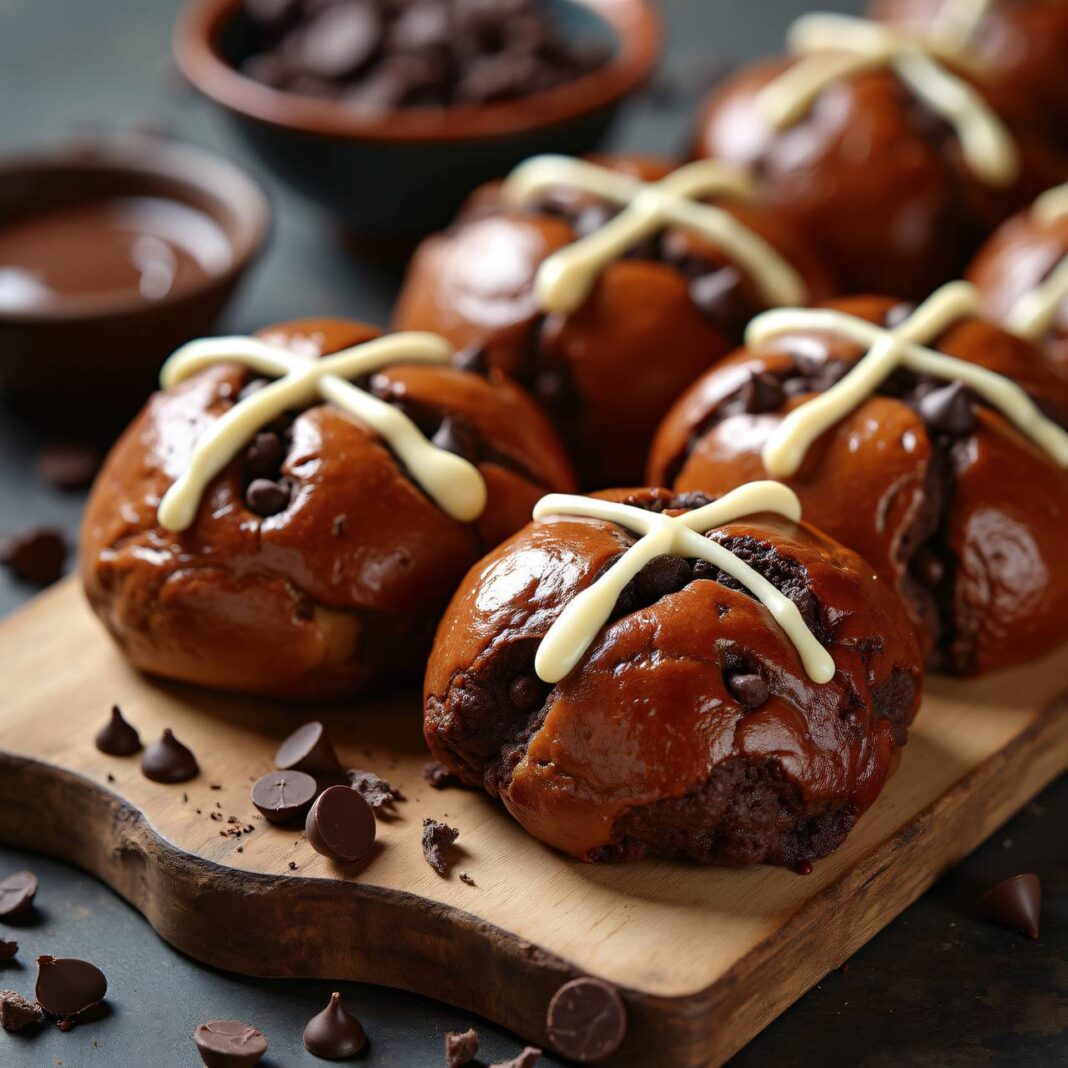 Zarte Schokoladen-Hefebrötchen mit einer süßen Garnitur, perfekt für das Osterfest oder als süßer Snack.