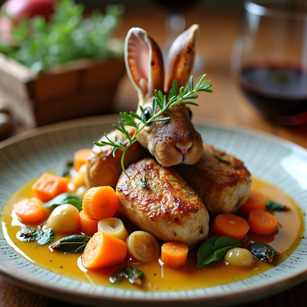 Ein rustikales Rezept für Kaninchen, das mit Speck, Gemüse und aromatischen Kräutern zubereitet wird.