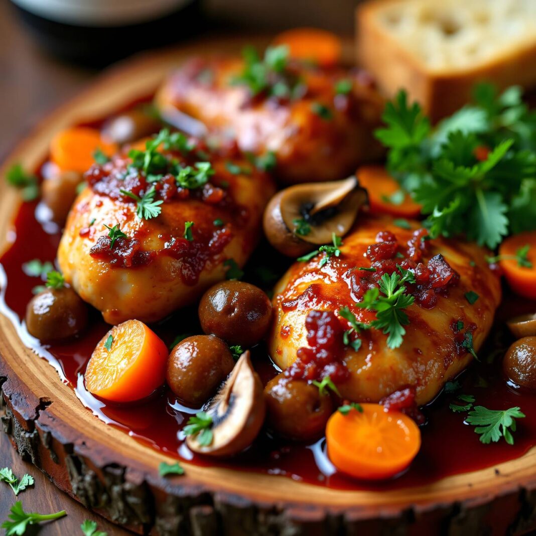Ein klassisches französisches Gericht, bei dem Huhn in Rotwein mariniert und dann langsam geschmort wird.
