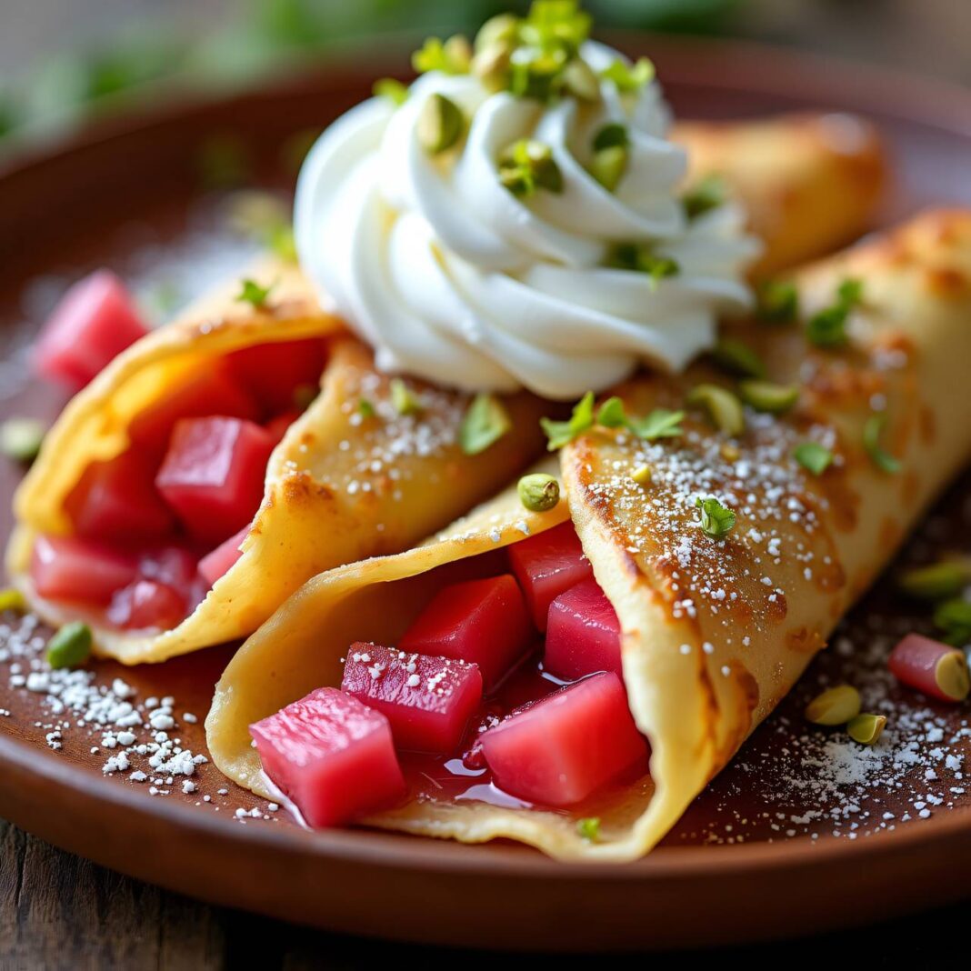 Leckere Crêpes gefüllt mit frischem Rhabarberkompott und garniert mit Schlagobers und Pistazien.