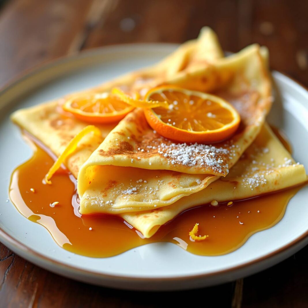 Ein klassisches französisches Dessert mit dünnen Crêpes, serviert in einer aromatischen Sauce aus Orange und Alkohol.