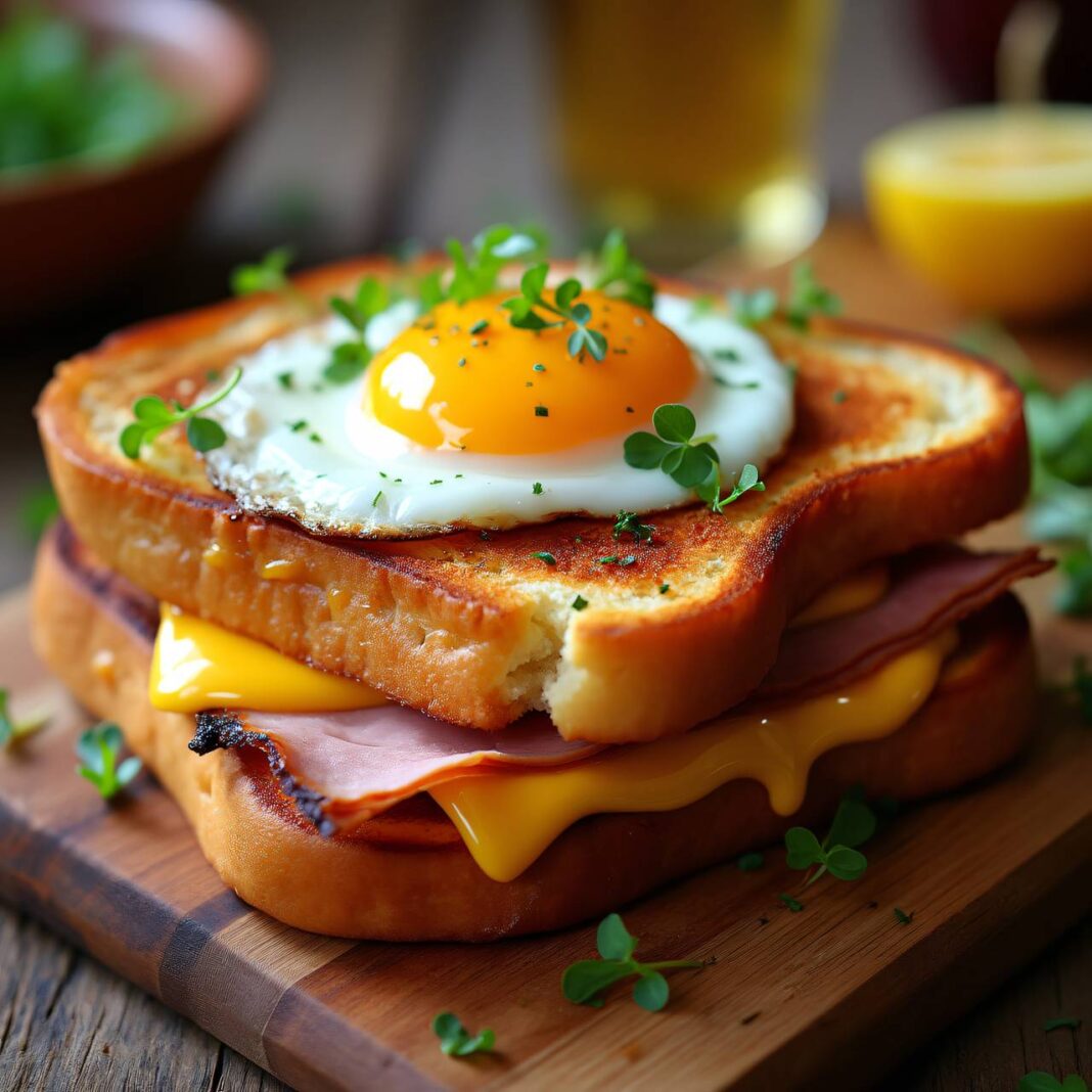 Ein köstliches Rezept für Croque Madame, ein französisches Sandwich mit Schinken, Käse und einem Spiegelei.