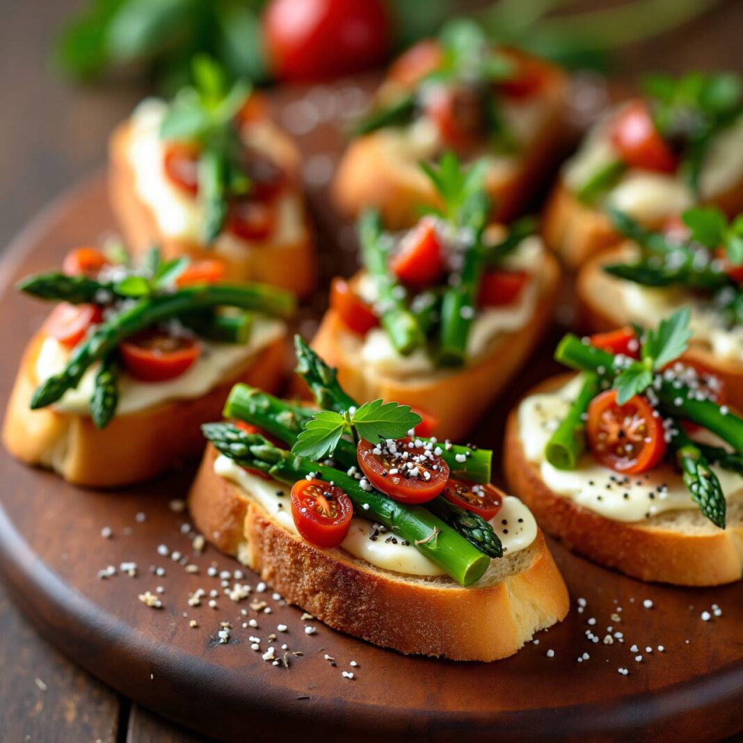 Ein köstliches Rezept für Crostini mit frischem Spargel, aromatischen getrockneten Tomaten und schmelzendem Brie.