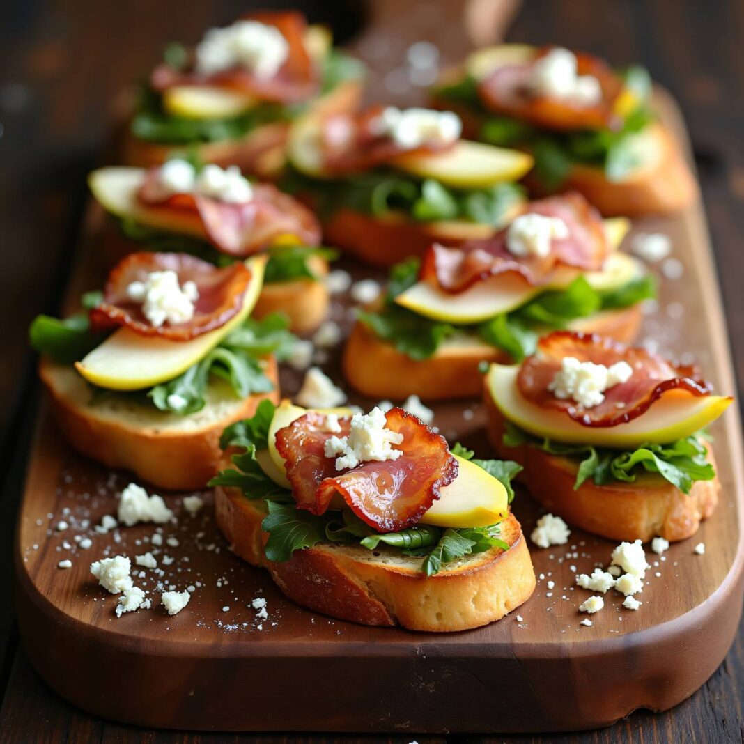 Leckere Crostini mit knusprigem Speck, süßen Birnen und cremigem Ziegenkäse, perfekt als Vorspeise oder Snack.