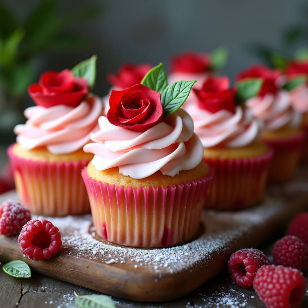 - Garnieren Sie die Cupcakes mit den vorbereiteten Rosen und Blättern.