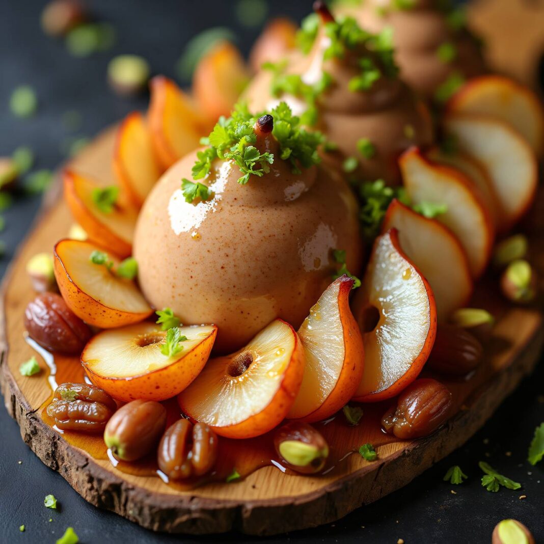 Die Dattelmousse gleichmäßig auf den Birnen verteilen und nach Belieben mit gehackten Pistazien und Dattelscheiben garnieren.