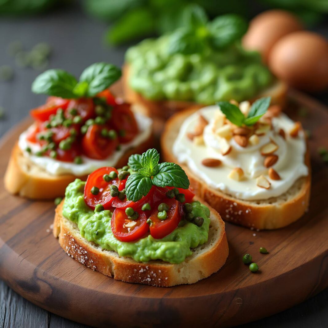 Ein köstliches Rezept für dreierlei Crostini mit Erbsen-Minze, Dörrtomaten und Käse-Mandel Aufstrich.
