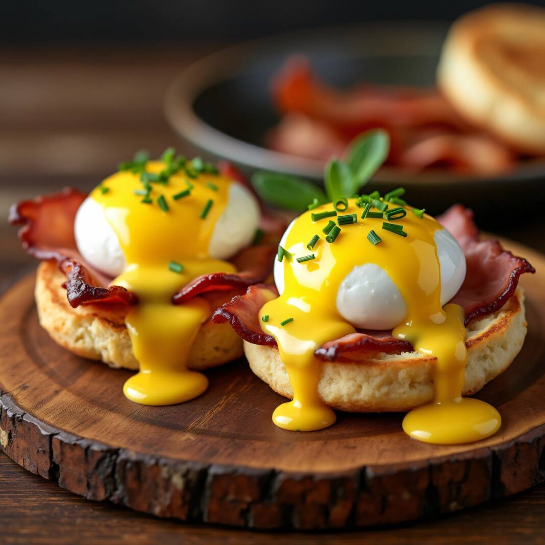 Ein klassisches Frühstücksgericht mit pochierten Eiern, Schinken und einer cremigen Sauce Hollandaise.