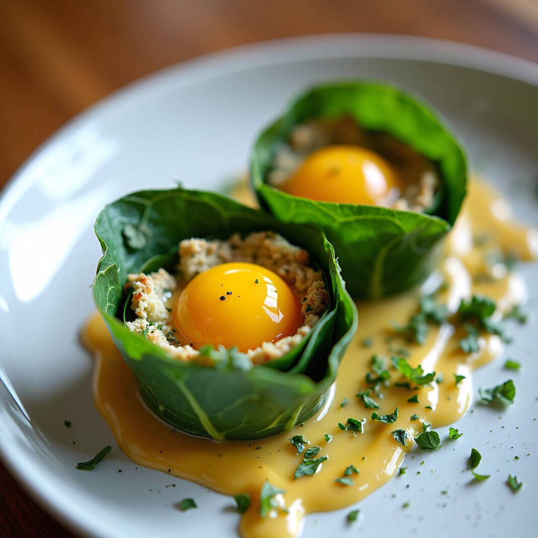 Ein köstliches Gericht mit Eiern, umhüllt von zart blanchierten Mangoldblättern und serviert mit einer aromatischen Kräutersauce.