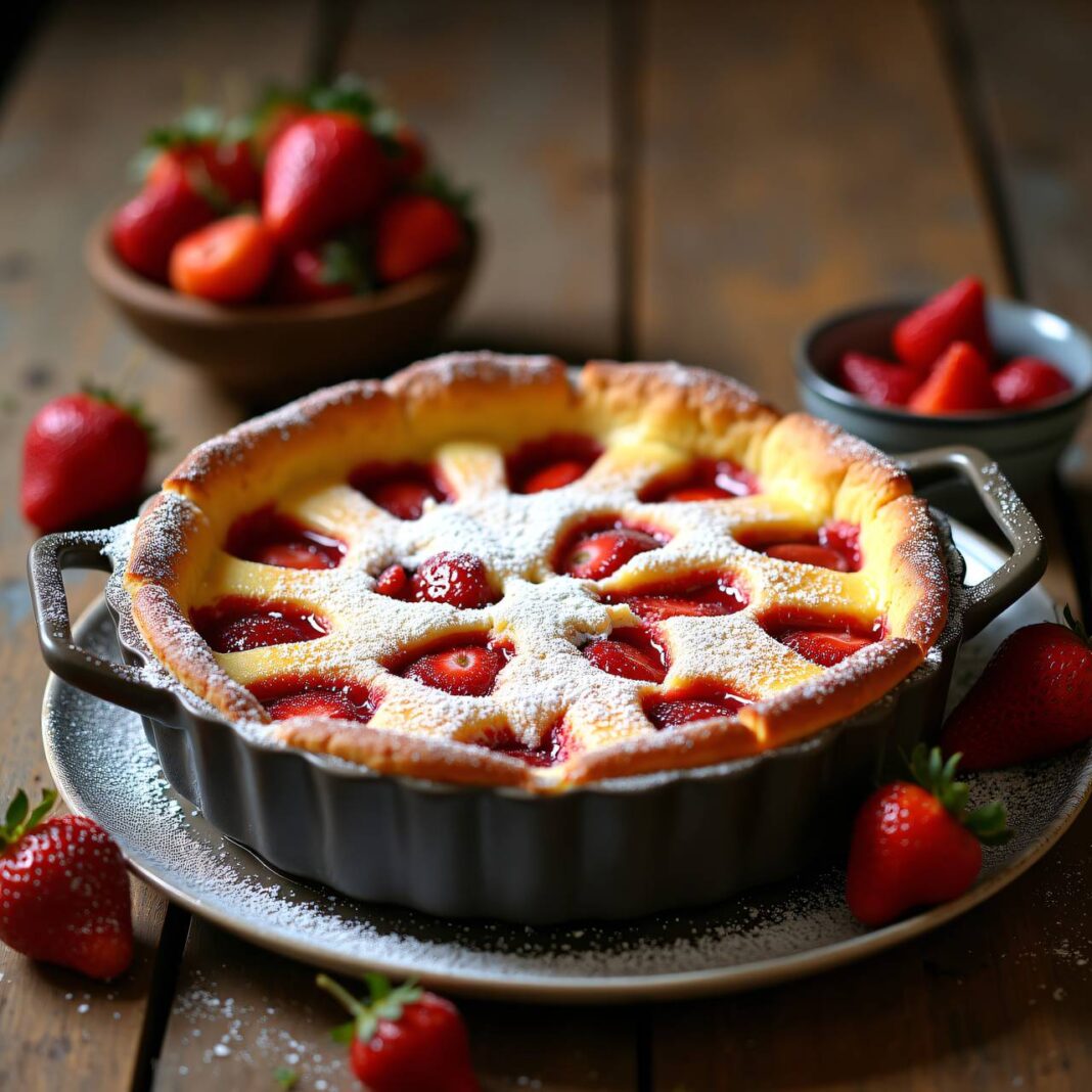 Ein köstlicher Erdbeer-Clafoutis, ideal für warme Tage. Serviert lauwarm und bestäubt mit Staubzucker.