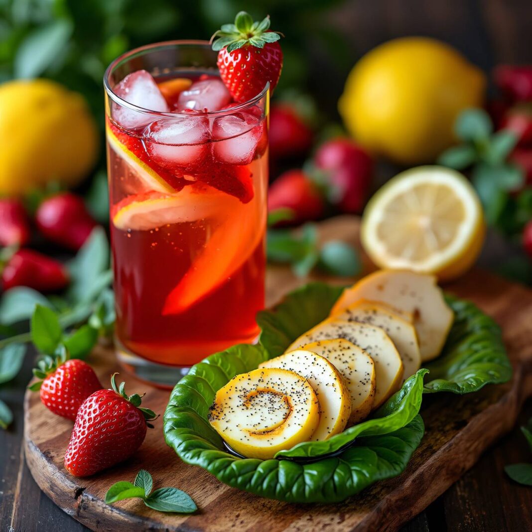 Eine erfrischende Erdbeer-Johannisbeer-Bowle, serviert mit gefüllten Lollo-Röschen aus Tête de Moine Käse und Lollo-Salat.
