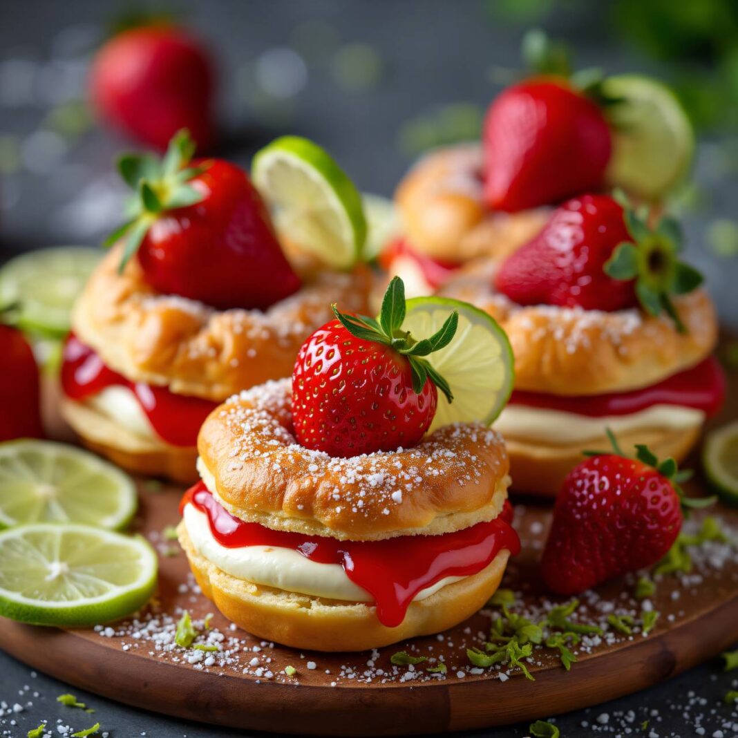 Ein köstliches Dessert aus luftigen Ringen mit einer fruchtigen Füllung aus Topfen und Erdbeermarmelade, verfeinert mit Limette.